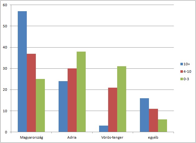 A búvárok, ha már merülnek, szépen lassan aztán felfedezik maguknak a hazai vizeket is. A kitöltőink 85 százaléka merült már Magyarországon, 89 százalékuk Horvátorszában. Érdekesség, hogy a válaszolók 75 százaléka jelölte be azt, hogy a Vörös-tengeren parti bázisú úton vett már részt, 76 százalék pedig ottani szafarin- egyre többen azonnal egy hajós szafarira fizetnek be. Ausztriában a válaszolók harmada járt már, a mostanában nagyon népszerűvé vált Indonéziában pedig alig valamivel kevesebb ember búvárkodott valaha a kitöltőink közül. Ez bizony azt jelenti, hogy többen voltak merültek a távoli országban, mint mondjuk Máltán vagy a szervezett utazással is könnyen elérhető Thaiföldön.