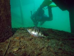 A hideg víznek köszönhetően kevés búvárral találkoztunk, a víz alatt viszont annál nagyobb volt a mozgás, számos sügér, pontyraj, pár rák bukkant fel 8-12 fokos vízben. A trepnik és az egyéb tereptágyak szokás szerint kitűnő állapotban voltak, a kötélzetben sem volt szakadás. A látótávolság pedig általában 6-8 méteres volt, talán az eddig legjobb merülésünk volt ez a mostani Neufelden. A tó medrének alján most nem úsztunk át a hideg miatt, de nem unatkoztunk a gyakrabban merült oldalon sem.