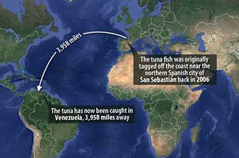 Az International Commission for the Conservation of Atlantic Tunas kutatói szerint a faj számára ez a távolság rekord, minden eddigi várakozást felülmúlt. Egy vörös tonhal amit Massachusetts (USA) mellett fogtal ki 3800 mérföldet tett meg, spanyol fajtársa ezt szárnyalta túl. A tonhalak megfigyelését a spanyol halászok segítségével a kormány 2001 óta végzi, hogy megállapítsák elegendő tonhal lesz a jövőben is a kereskedelmi tonhalhalászat számára.
