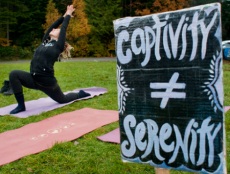 A Vancouverben működő akváriumban más intézményekhez hasonlóan tengeri emlősöket is megnézhetnek az érdeklődők. A fogságban tartott intelligens állatok ilyen intézményekben való mutogatása folyamatosan vitákat gerjeszt az egész világon (még nálunk is, egy csoport delfináriumot szeretne Budapesten, amit jelenleg a törvények tiltanak).Nem szokatlan, hogy megpróbálják kihasználni a kardszárnyú delfinek vagy belugák vonzerejét ezek az intézmények, ám Vancouverben még jógaórát is hirdettek, amit a delfinek medencéje előtt tartanak. Amikor erről tudomást szerzett két helyi jógaoktató, Cynthia Ganatra és Corrie Kielbiski, azt hitték, csak viccelnek velük. Ám kiderült, tényleg vannak ilyen órák, ezért tiltakozásként az akvárium előtt tartottak ingyenes jógaórát, pont akkor, amikor bent az állatok előtt gyakorlatoztak a bálnás jógára befizetők.