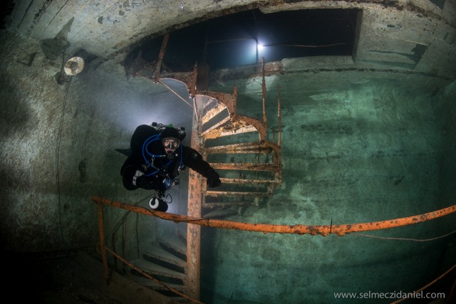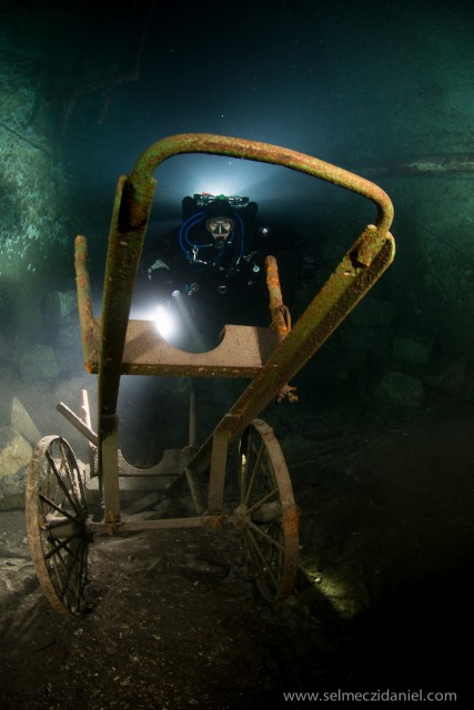 A terem alján látható néhány itt hagyott eszköz, van egy lefele vezető csigalépcső, ami mellett egy szinttel mélyebbre úszhatunk és szétnézhetünk egy kis teremben, aztán a teremből nyíló járatokba mehetünk be. Az egyikben kiválóan látható, hogyan fejtették ki a nagy kőtömböket, és van egy több szintű járat, aminek az első métereit nézhetik meg a nyílt vízi búvári végzettséggel rendelkezők. A helyet kiválóan ismerő Hosszú Attila kalauzolásával egy részletről sem mardunk le, az alapos eligazítás miatt pedig pontosan tudjuk, hol mi vár majd ránk. Az emberben dolgozik az adrenalin, eleinte nem érzi azt, hogy a víz hűvös, és szerencsére kicsi a terem, tehát aki fázik, az pillanatok alatt a kijárathoz érhet. De a víz egyáltalán nem szélsőségesen hideg, szó nincs sarkvidéki élményről, sokan merülnek itt neoprénruhában- akinek van egy vastag overállja, kesztyűje és csuklyája, az nyugodtan bevállalhat egy 40-45 perces búvárkalandot.