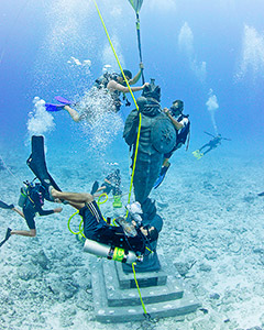 A fél tonnás szobor mozgatása persze nem egyszerű feladat. Kötelek segítségével eresztették le, de természetesen néhány emelőballont is rögzítettek rá, nehogy túl gyorsan ereszkedjen le. Majdnem egy óráig tartott az elhelyezés, aztán a búvárok visszatértek, és véglegesen a talapzathoz erősítették a szobrot.