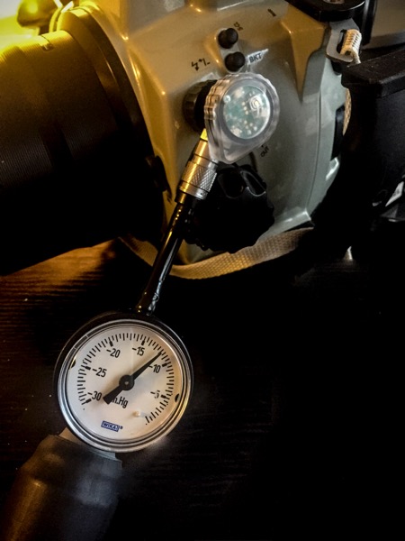 Szükség volt egy olyan eszközre amivel úgy tudunk tesztelni, hogy ha valami nem stimmel rendszer tömítettségében az még a merülés előtt kiderüljön. Ez pedig a vákuum, tehát azt kell elérnem, hogy a tokon belül vákuum keletkezzen és amennyiben ez a vákuum csökken úgy a víz is be fog jutni a tokon belülre. Tehát szükség van egy egyirányú csatlakozóra, egy pumpára és egy mérő órára. Amennyiben a tok fél órán keresztül tartja a vákuumot nyugodtan merülhetünk, hiszen szinte biztosra vehetjük, hogy nem fog semmilyen meglepetés érni. Ennek van egy további előnye: a merülés legkritikusabb szakaszán, a vízbeugrás során ahol a legkisebb a tömítettségünk, a vákuum “összetartja" a tokot.