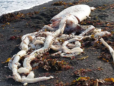 Népszerű (kamu) kép az interneten, amikor hatalmas tintahal tetemet állnak körbe a tengerparton. De néha tényleg történik ilyesmi.