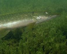 Másnap reggel Bunny azt javasolta, menjünk újra a Grüner See-hez, de én már elszántam magam a hosszabb utazásra, így hát kiadtam a jelszót: irány Mariazell és az Erlaufsee! A reggeli alatt csatlakozott hozzánk a panzió gazdasszonya, aki egy, a térképeken nem szereplő útvonalat javasolt. Volt egy elég érdekes hegyi, erdei útszakasza, ami keskeny és kissé rázós is volt, aszfaltozás nélkül, de a budapesti utakhoz szokott sofőrök semmi kivetnivalót nem találtak benne. Szűk órányi autózás után érkeztünk el a Harry´s Tauchschule jól ismert bázisához. Palacktöltés közben érdeklődtem, mi újság a környéken, de nem sok jóval biztattak, maximum 3-5 méteres látást jósoltak. Bunnyval ketten indultunk el, először 10-12 méter mélyen néztünk szét a tavalyinál tényleg valamivel rosszabb látótávolságú vízben, és sok érdekeset nem találtunk - hacsak a kertitörpe gyűjteményt nem vesszük annak. Nagyjából 25 perc után Bunny széttárta a kezét, mi a jó ezen a helyen? Éreztem, sok morgolódást úszok meg, ha megmutatom, hol is lehet érdekeset látni, azok után, hogy nem a Grüner See-t választottuk. Mutattam, irány a sekély! Bunny követett, egyre bizonytalanabbul, hiszen már két méteren voltunk, szinte kilátszott az uszonyom vége a vízből. Elindultunk a fal mellett visszafelé, először a hínárok tűntek fel, majd sügérek, nagy számban. Az első csukát szinte egyszerre vettük észre, én pedig elkezdtem fotózni, igyekezve megtalálni a legjobb beállítást. A csuka néha lustán tovább úszott, mi pedig követtük. Aztán találtam egy másikat, akiről portrét is tudtam készíteni, Bunny elindult az első után - a látás ugyan nem volt az igazi, azért el nem nagyon veszthettük egymást. Újabb békés csukák tűntek fel, mint Bunny megállapította, a két méteres "csukamélységben", aztán találtunk egy, az aljnövényzetben hasaló példányt, akit együtt fotóztam a modellkedő Bunnyval. Végül bőven több, mint egy órás merülés igazolta: nem volt rossz döntés az Erlaufsee.