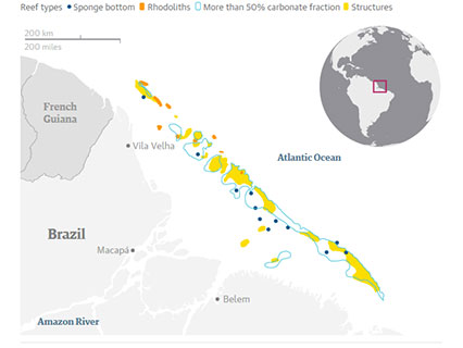 A mintegy 965 kilométer hosszú korallzátony, amely Francia Guyana partjaitól húzódik Brazília Maranhao szövetségi államáig, meglepte a tudósokat, kormányzati illetékeseket, valamint az olajvállalatokat, amelyek megkezdték az olajfeltárási munkálatokat a térségben - adta hírül a The Guardian. A korallzátony létezésére senki nem gyanakodott, mivel a világ nagy folyói szétszabdalják a zátonyrendszereket, és ezért azokon nem nő korall. Ráadásul a korallok a tiszta, napfénnyel jól átitatott, sós vizekben élnek, viszont az Amazonas torkolata a világ egyik legiszaposabb torkolatvidéke, a folyó több ezer kilométeren magával sodort és óceánba mosott hordalékával.