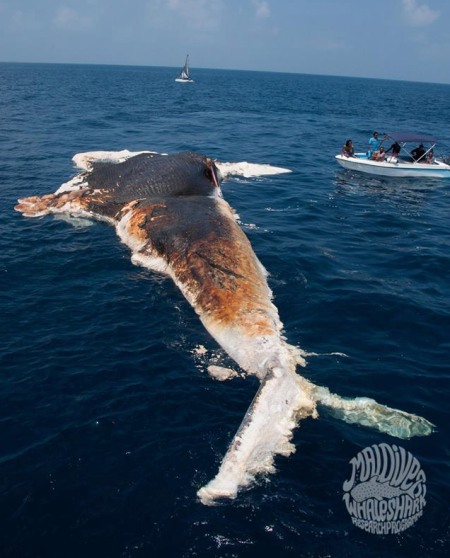 A Maldives Whale Shark Research Programme oldalán megjelent beszámoló tanúsága szerint a víz tetején lebegő bálna tetemének hosszát meg sem tudták mérni, több, mint 25 méteres lehetett. Elpusztulásának okát nem lehet tudni, és vélhetően ki sem derülhet, mert a felbukkanó ragadozók gyorsan nekiláttak az eltüntetésének.