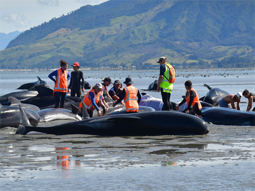 Négyszáznál is több (más források 650-et említenek) gömbölyűfejű delfin vetődött partra egyszerre Új-Zélandon. A szigetország történetének legdrámaibb ilyen balesete Nelson mellett történt, és a bálnák nagy része elpusztult, bár jelentős részüknek sikerült a dagállyal visszajutni a mélyebb vízbe. Az emberek kétségbeesve próbálták megmenteni a még életben lévő állatokat. Önkéntesek százai dolgoznak azon, hogy ne száradjanak ki a partra vetődött bálnák ( videó az oldalon ), de több száz példány ennek ellenére a parton pusztult. Az új-zélandi természetvédelmi minisztérium emiatt lezárta a tengerparti szakaszt, mert attól tartanak, hogy a melegben gyorsan oszló állattetemek felrobbannak.
