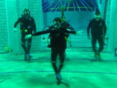 A január óta tartó edzéseken először a medence partján szóban elmagyarázza a tanárnő a lépéseket, majd a vízben begyakorolják a mozdulatokat. Természetesen az óra nem tart órákig, hisz a palackokban sokkal gyorsabban fogy a levegő egy-egy hip-hop edzésen, mintha csak halakat nézegetve úszkálnának neoprén ruháikban. Ráadásul még 10-12 kg ólmot is viselnek magukon, hogy a medence alján tudjanak maradni.