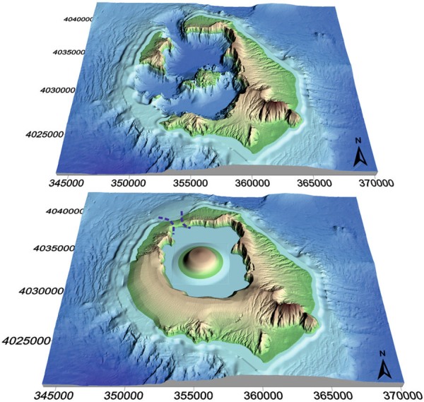 Karátson Dávid rámutatott, hogy a szakemberek sokáig azt gondolták, a kitörés előtt egységes sziget feküdt a mai Szantorini helyén, amely a vulkán felrobbanásakor beszakadt, hátrahagyva a szigetcsoport ma ismert részeit és belső öblöt. Azonban később kiderült, hogy már a minószi kitörést megelőzően is létezett egy, a maihoz hasonló kisebb belső, vagyis kalderaöböl Szantorinin.