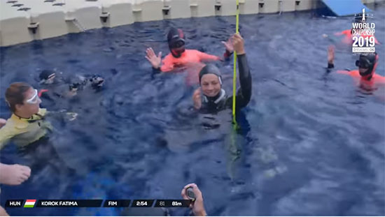 A világbajnokság harmadik napján a női búvárok mérték össze a tudásukat az uszony nélüli szabad merülés versenyszámában. A magyar versenyző elsőként bukott a víz alá, hogy teljesítse az általa kijelölt 81 méteres mélységet. Az alacsony hőmérséklet és a szakadó eső nem zavarta meg Fatimát, magabiztosan úszta le a távot. Ezt a mélységet csak az utána következő orosz Gillespie Marianna-nak sikerült teljesítenie.