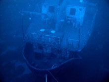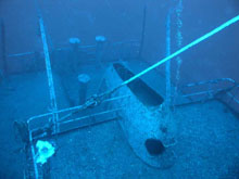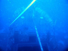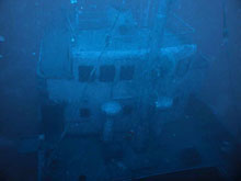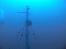 Fél óra hajózás, és negyed óra keresés után meg is találtuk a nagy piros bóját. A vízbemenetelt követően nem kis erőfeszítésünkbe került, mire elvergődtünk a hajó végétől a vezető kötélig a nagy sodrás és a hullámok miatt. Szerencsére 10 méter körül majdnem teljesen megszűnt az áramlat, így a merülés alatt nem kellett különösebben küzdenünk az elemekkel. Süllyedés közben kb. 18 méteren kirajzolódtak a hajó vonalai, 25 méteren a jó látási viszonyoknak köszönhetően már jól lehetett látni a részleteket is, jól kivehető volt, hogy a hajó hátsó részére lett erősítve a kötél, ami mellett ereszkedtünk. 30 méterre megérkezve elindultunk a hátsó árboc felé, tartva az előre megbeszélt maximális megengedett mélységet. Az árbocot elérve elhaladtunk a hajóhíd felett, melynek teteje alattunk 4-5 méterre lehetett. Látszott, hogy alaposan felkészítették a hajót a búvároknak a biztonságos roncsmerüléshez, mert minden ablakot, és ajtót leszedtek róla az elsüllyesztés előtt. Jól látszódtak a nagy, könnyen átjárható terek. Továbbindulva a hajó eleje felé átúsztunk a két hatalmas nyitott raktér felett. Szerintem, ha oda is be szerettünk volna úszni, bőven negyven méter alá kellett volna merülnünk. A hajó elejét elérve még időztünk ott egy kicsit, aztán vissza kellett indulnunk a vezető kötélhez, mert komputerünk már csak öt percet engedélyezett ebben a mélységben. A lassú emelkedéssel és a biztonsági megálló betartásával is csak 25 perc lett a merülés.
