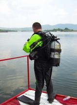Rövid, egy órányi, mérsékelten jó minőségű úton való autózás után helyben vagyunk. A bázis tulajdonosa, mint korábban is, kedves, lelkes, segítőkész. A vízbejutás kulturált, a parton betonlépcsők, palló, a vízen nagy stég, rajta búvárlépcső - ez majd kifelé jön jól. A stég felfestve piros-fehér búvár színekkel. A víz kellemes, 20 fok körüli. Látótávolság mérsékelt.