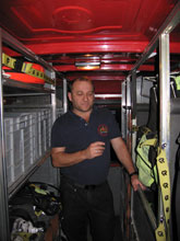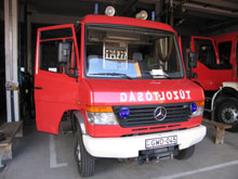 Először erről, és a csoportokról kérdeztem beszélgető partneremet, a 18 éve tűzoltó búvár Szalai Lászlót. Az itt látható jármű, amit 1999-ben kaptuk az önkormányzattól egy Mercedes, terepjáró képességekkel is -korlátozottan- megáldott tűzoltó autó, amit kimondottan a búvár egységek igényeinek megfelelően alakítottak ki. Két fő utazik elöl, négyen háttal a menetiránynak, hátul foglalnak helyet.