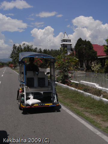 Sulawesi motorizáció zászlóshajójaDSC_Maker DSC f 7.2 1/640 sec Ez egy motor riksa öszvér járgány. Hátul motor, elől riksa. Két helyi emberke fér be előre. Külön adrenalin fröccs az elől utazónak, hogy az összes rizikós előzést közelről tapinthatja.