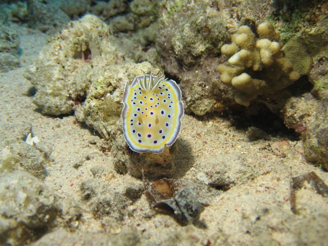 Canon PowerShot A520 f 2.6 1/400 sec Yolanda Reef. Párom vette észre, aki szólt egyik merülőtársunknak, aki szólt nme-nek s ő szólt nekem, hogy menjek ugyan már oda, mert ott van egy csodaszép csiga. Közben én a tekit fotóztam. Emiatt a gyönyörűség miatt azonban érdemes volt elúszni tőle :)