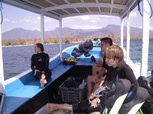 Előbb a bázisára mentünk, ami a családi háza udvarán egy melléképületben volt. PADI 5*, közben az udvaron a család, gyerekek rohangásztak mindenfele, és előkerült egy balinéz guide is, Ketut. Izgultunk, hogy tényleg lesz-e a többieknek megfelelő méretű bérelt cucc, de volt. Egyébként nem ijedtünk meg, látszott a srácon, hogy megbízható, tuti ismeri a terepet, azon meg, hogy a bázisa lepukkant, gyorsan túlléptünk. A cuccok kosarakba kerültek, azok meg a mikrobuszba. 15 perces transzfer a "kikötőig", ami egy szakadt móló, szakad halászladikokkal. Szélesebb hajók voltak, mint a jukungok, kis motorral, fedett résszel, amit értékeltünk, hiszen jó 30 perc volt az út Menjangan szigetéig a lélekvesztőkkel. A kikötőben nagy a sürgés-forgás, felszerelésünket bepakolták a hajókba. Itt is járt az ellátás a merülések között: víz és ebéd.