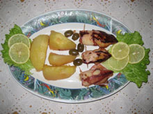 Tintahal, ami gyakori fogás itt az asztalon, s a vendéglőkben is. Szerintem az adriai a legfinomabb. Étlapokon ezt külön jelölik (ahol még kapható), s többet is kérnek érte, mint a világ egyéb tájairól importált lényegesen olcsóbb mirelitért. Roston és karikára vágva-panírozva mindenki ismeri. Ám másképp is lehet. Igazi szezonja októbertől a tél végéig tart. A napi munka után rajzanak ki a kis csónakok, ha sima a tenger, s mindenki saját "tikos" metódusával, saját helyén pecázza a tintahalat. Ekkor sok a nagyobb méretű. 20-25 centiméteres példányok is akadnak. Jó tudni, a friss tintahalat is érdemes (muszáj) megfagyasztani, legalább egy napra. Sokkal puhább, omlósabb ezután elkészítve.