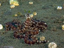 Ezek után persze mindketten belecsaptak a polipvadászatba -aztán úgy alakult, hogy szégyenszemre én találtam az első és a legtöbb polipot, igaz mimic-et nem leltünk, de akkor is elismerték, magyar lett a PJ királya! Második merülésen aztán Peter egyenlített (Jonathan nem jött be, mert indulnia kellett reggel, és a hegyeken át ment), én találtam egy mimicet de üregben illetve több simát, viszont ő kiszúrt egyet amint kint terperszkedett a homokon, jó fotóalanyként. Aztán lőtt még nekem párat vicces közegben, csigaházban, kókuszhéjban, úgyhogy megosztottam a trónt. Talán mondanom sem kell, este a vacsoránál Jonathan mit kapott, hogy kihagyta a második merülést és így nulla találattal a szégyenteljes harmadik helyre szorul!