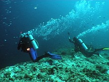 Az itteni merülések a következőképpen zajlottak le: a torkolattól 50-100 méterre a nyílt vízen üres jackettel ugrás, aztán minél gyorsabb süllyedés, hogy elérd az előbb említett peremet. Ha ez nem sikerül, akkor elszálltál- az áramlás bevisz a csatornába és onnan vissza nem nagyon tudsz jönni és elszalasztottad a lényeget. Ha elérted a párkányt, megkapaszkodsz egy sziklában, és megpróbálod rögzíteni a direkt erre a célra kitalált reef-hookot, amit már menet közben érdemes kézben tartani.