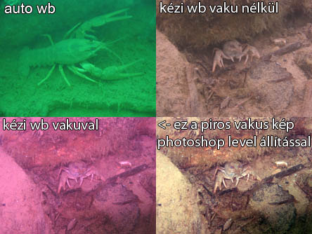 Mind a négy kép hazánkban, az ecsédi édes vízű tóban készült. Az első képeken a fényképezőgép állította a fehér egyensúlyt, az édes víz miatt zöld lett minden, a barna rák és a homokos aljzat színe is eltűnt. Ez a kép menthetetlen, retusáló programmal sem hozható értékelhető szintre. A második kép egy fehér műanyag lapra történt kézi wb állítás után ugyanott, ezek a valódi színek, ez az ideális kép. A kép tiszta, nem zavarja lebegő szemcse, semmi. Semmi utómunka nem kell csupán pár másodperces előkészület, amíg fehér egyensúlyt állítunk a gépen. A harmadik kép a kézi wb állítás egyik veszélyét mutatja, mert ha vaku is véletlenül elvillan, piros lesz minden. Ez nem akkora gond, mint gondolnánk. A negyedik képen az látszik, hogy az ilyen piros túltengéses kép még menthető retusáló program level állításával, a színek mesterkélt hatásúak, de sokkal jobb mintha az auto wb után próbálnánk retusálgatni. |