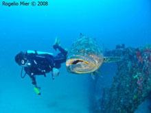 Gyors öltözés, ugrás és azonnal le a bója kötele mentén, különben elrepülsz az áramlattal és Kubában jössz fel a felszínre. A kötél a hajóroncs orrán álló ágyú mellett van lekötve. Itt még mindig erős az áramlás. Gyorsan elbújunk az "árnyékos" oldalon és megindulunk a hajó tatja felé, ahol a sügér lakik. Néhány perc keresgetés után örömmel nyugtázzuk, hogy itthon van. Kattognak a fényképezőgépek, körbeúszkáljuk alulról-felülről a nagy halat. Rogelio teljesen belemerül a fotózásba, ezért feleségemmel magukra hagyjuk őket és beúszunk a roncs belsejébe. Lemegyünk az aljába, a hatalmas dízelmotor egy darabban van. Több helyen a kisebb ablakokat nagyobbra vágták mielőtt elsüllyesztették, így szinte bármelyik pontról ki lehet jutni gyorsan. Van benne egy vezetőkötél is, de ez inkább zavar mint segít. Végignézegetjük a kabinokat és végül eljutunk a kapitányi hídhoz. A fülkében egy kb. másfél méteres barrakuda "ül". Nagy ívben kikerüljük és kiúszunk egy nyíláson. Kívül megint erős áramlás, vissza a bójakötélhez és indulás fel. A biztonsági megálló alatt zászlóként lobogunk a kötélen. A fotós csapat is jön már felfelé. A felszínre együtt megyünk fel, gyorsan kimászunk a vízből és irány a part. Visszafelé már nem olyan vészes, mert a hátulról érkező hullámok szépen tolják a hajót sekély víz felé. Kikötünk a mólónál a ferde világítótorony mellett, pakolás a kocsiba és ebéd...