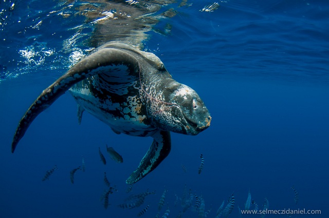 Nem csak ámbráscetekkel találkoztunk az Atlanti-óceánban: feltűntek nagy csapatokban rövidcsőrű közönséges delfinek (Delphinus delphis), továbbá palackorrú delfinek (Tursiops truncatus) és Risso-delfinek (Grampus griseus) is. Az utóbbiakkal csak egyszer találkoztunk, hiszen igen ritka és félénk faj, a hajókat messze elkerülik. Viszont közönséges delfinekkel szinte minden nap találkoztunk. Nagy csapatokban kísérték a motorcsónakot, és a fiatal egyedek gyakran a hajóorr közelébe úsztak, hogy az általunk keltett hullámokon lovagolhassanak. Óriási élmény volt továbbá, amikor egy kérgesteknőst (Dermochelys coriacea) fedeztünk fel a távolban. Angol néven leatherback-ként emlegetik. A kérgesteknősök a ma élő tengeri teknősök között a legnagyobbak. Teljes testhosszuk (fejtől-farokig) 1.83-2.2 méter között változik, a mellső végtagok/úszók hossza elérheti a 2.7 métert is, testtömegük pedig a 700 kilogrammot. Nagyon ritka teknősfaj, és még a helyiek is csak elvétve találkoznak vele. A hüllők között az egyedüli faj, amely képes közel állandóan magas szinten tartani testhőmérsékletét: az akár 10 fokkal is magasabb lehet, mint például az Atlanti-óceán 18 fokos vize. Azt hiszem, ezt is azok közé a különleges felszín közeli búvárélmények közé sorolhatom, amelyek ugyanúgy fantasztikusak mint a mélyebben átélt kalandok.