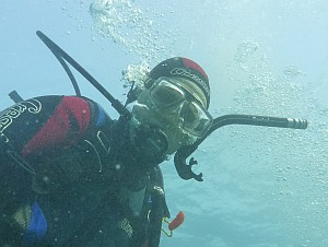 A haditerv a következőképpen nézett ki: mellény felfúj, automata szájba, felszerelés megfog, nagyot lép, majd a felszínen csere a pipára, és lélegzik. Nem is bonyolult. A gondos tervezést precíz kivitelezés nem követte, ugyanis a nagylépés, bár elmagyarázták, és már láttam is többször bemutatva, nem sikerült teljesen tökéletesre. Ennek legfőképpen az volt az oka, hogy én ballábas vagyok, de a bal uszonyomra ráléptem a jobb uszonyommal, így hát ez egy nagy dőlés lett leginkább. Attila már várt rám a vízben, de ezt látván egy kis levegőt eresztett ki mellényéből hogy még lejjebb süllyedjen, nehogy őt is felismerjék.