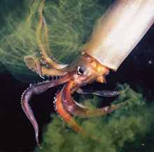 Igazán mozgalmas volt az éjszaka a Kaliforniai-öbölben: a mexikói vizeken halászó hajók erős reflektorainak fényében valósággal forrt a tenger a kalmároktól. Leesett az állam e hatalmas állatok láttán. Némelyikük akkora volt, akár egy ember – csaknem kétméteres, s majd’ 70 kilós. Több mint harminc éve tanulmányozom a kalmárokat, de ekkora példányokat még sohasem láttam. Búvárfelszerelést húztunk, majd társammal, Brian Skerry fotóssal belevetettük magunkat az óriás repülőkalmárok kavargó tömegébe. Ez a Csendes-óceán keleti részén élő faj harcias ragadozó – bármit megtámad, a szardíniát éppúgy, mint a búvárokat. Még gyöngyözött a víz az ugrásunk helyén, amikor Brian riadtan fölkiáltott: egy jókora kalmár súrolta a karját. A fotós előrántotta búvárkését, hogy megvédje magát, az állat azonban elmenekült.