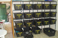 A bázis sűrített levegő mellett nitrox töltésére is be van rendezkedve, és lehetőség van felszerelés bérlésére is természetesen. A felszerelés számára egy komplett falnyi polc, hatalmas műanyag ládákkal áll a búvárok rendelkezésére, körben pedig a ruhákat lehet kiakasztani száradni. A bázis mögötti udvaron édesvíz és szárítókötél várja a sós búvárfelszereléseket. A felszerelésünket a hajó és a bázis között a bázis járművével mozgatják, szóval érkezéskor bepakolunk a bázisra, és utána akár gyalog is lesétálhatunk az apartmantól, mint ahogy én is ezt tettem.Mivel a bázis a tengerparti sétányon van, közvetlen mellette hangulatos éttermek, boltok találhatóak, előtte kikötő, parkolóhely.