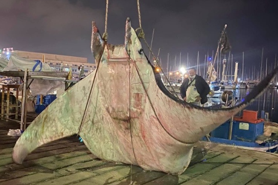 Egy hatalmas, de már elpusztult ördögráját emeltek ki a szicíliai Palermo egyik kikötőjéből. A 400 kilós állatból valószínűleg kiállítási tárgy lesz.