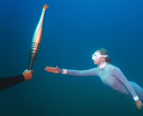 Alice Modolo francia búvárúszó a Földközi-tenger alá vitte a hivatalos fáklyát az olimpiai fáklya váltófutásának részeként június 18-án.