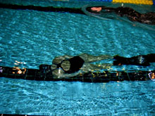 Rövid szünet után kezdődhettek az úszások. Itt is van indulási lista, itt is hasonlóan van versenyzóna, átmeneti zóna és bemelegítő zóna a medencében, ám a dinamikus számnál egy pályán zajlott a verseny. A medence partjára végig centiméter lett rögzítve, hogy a felszínre érkezéskor a bírók le tudják olvasni az elért távot. A versenyzóna sávjában két biztosító búvár a felszínen követi a búvárt, gyakorlata végrehajtása közben. Mivel víz alatt könnyebb gyorsabban úszni, ezért a mindketten csak a sáv felére figyelnek, ott váltják egymást. Elinduláskor a medence falától 1,5 méter áll a versenyző rendelkezésére, hogy a felszín alá bukjon. A felszíni protokoll megegyezik a statikussal. Igen szép eredmények születtek. Magyar részről nagy örömünkre új nemzeti csúcsot úszott Bauer Miklós, uszony nélkül 109 méterig jutott. Uszony nélkül az olasz Andrea Richichi volt a második legjobb 104 méterrel. Öten már eredetileg is 100 métert jelentettek be, és végül tizenkét versenyző került a 100 felettiek klubjába Székesfehérvárott. A cseh Petr Dracka (127m), Petr Augusta (128m), a holland Peter Wurschy (130m), Horváth Zoltán (141m!) és meglepetésre a szlovén Luka Pengov (139m, ismét csak élete eddigi legjobb eredménye) tudott több, mint 120 métert úszni egy levegővel. Sajnos Zoltán úszása nem lett érvényes, amiben közrejátszott az is, hogy az elinduláshoz segítségül a vízbe tett asztalnak ütközött a 100 méteres fordulónál a körülmények szerencsétlen összjátéka következtében. Érdemes megjegyeznünk a két magyar versenyző nevét, mind a kettejüknek ez volt az első versenye.