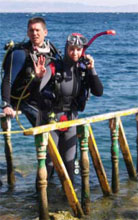 22 m-ről újra a part felé tereltem laza gombóc formában kavargó nebulóimat. A parttal párhuzamosan 10 és 5 m között bogarászva indultunk vissza a bázis irányába. A bázis közelében a kavicsos-homokos rézsű tengeri fűvel benőtt pázsittá alakult át, amiből a csikóhallal rokon, 20-30 cm hosszú, botszerű kis pipahalak leselkedtek felénk. A zöld tájat eldobált gumiabroncsok, hordók és egyéb háztartási roncsok "gazdagítják". A tenger lakosai már beköltöztek ezekbe a mesterséges zátonyokba: minden rozoga darab egy-egy murénának, gömbhalnak, oroszlánhalnak, ráknak vagy polipnak szolgál otthonául.