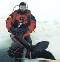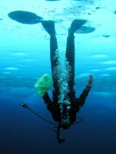 Enyhe félhomály fogad a víz alatt. Majdnem elfelejtettem említeni, a cikkekben azt olvasni, ha süt a Nap és nincs hó a jégen, gyönyörű szivárványban legeltethetjük a szemünket. Az én szemem nem legel most éppen, mint ahogy a Nap sem süt. Ellenben hó az bőven van a jég felszínén. A szivárványnak lőttek. Úgy látszik kevés a tapasztalatom, mert az eddigi jég alá merüléseim során csak egyszer vagy kétszer volt napsütés. De akkor is hó borította a jeget. Ez a szivárvány dolog csak az öregek meséje, esetleg tudálékos fizika könyvek elméletieskednek, hogy a jégkristályok prizmaként működhetnek. De foglalkozzunk a túléléssel... Hol vannak a társak, mit csinálnak? Hm.. rosszul esik ilyen hidegben, de meg kell őket dicsérni, szépen kontrolláltan süllyednek, nem koppannak a tó fenekén, hál´ istennek én sem. Itt látni. Ezek szerint az előző hat sem ma kezdte a búvárkodást. Az arcom egyre jobban fáj. Azt hittem elmúlik. Úgy emlékszem régebben nem fájt. Sok kis tű szurkálását éreztem, az sem volt kellemes, de nem fájt. Most igen. Az egyik társ erősen mutogat. Micsoda, menjünk fel? Még csak most jöttünk alig vagyunk lenn három perce. Na mindegy, ha ki kell menni, akkor ki kell, de miért nem a lék felé úszik? ő tudja. Nyugodtan úszunk tovább. Amikor oldalra nézek akkor jeges víz folyik be a nyakamnál, innentől kezdve nem nyakból fordulok a társak felé. Két oktató trepnit látok egyszerre, ez azért nem szokványos. Az egyik társ megint mutogat. Megvilágosodásom van, a srác az irányt mutatja nem pedig azt, hogy menjünk fel. Ez azért megnyugtató. Kicsit ideges a derekára kötött kötél meg a mi vezető száraink miatt. A saját kötelemet kivarázsolom a lábai közül, feszesen tartom, hogy ne zavarja. Egész jól ellátni minden irányba, a kezemen érzem, hogy hideg van, de az arcom már nem fáj. Lassan kimért mozdulatokkal úszom. Régebben, egyszer amikor már fázni kezdtem, arra gondoltam, hogy egy kis mozgással felmelegítem magam és elkezdtem gyorsan krallozni. Igen gyorsan abbahagytam, a második mozdulatnál éreztem, hogy ha ezt tovább folytatom, akkor begörcsölök. Nem a talpam, nem a vádlim, hanem a combom. Elég kellemetlen érzés volt, azóta lassan, megfontoltan úszom hideg vízben. Mutatnak egy rákot, elég picike, szegénykémnek egész tavaszig itt kell lennie. Nem is nagyon virgonckodik. Tovább megyünk.