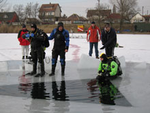 No a lék kész, jelentkezők befutottak, rövid eligazítás, kiemelve a jég alá merülés specialitásait. Ilyenkor a felszínen van egy biztosító búvár, akivel egy kötélen át kapcsolatban állunk, ezért szó volt a kötélkezelésről, az általa közölt jelekről. Mit tegyünk ha elfagy a reduktor, és főleg hogyan kerüljük el. Végül beöltözünk, bár én már félig ezt megtettem előre, ugyanis a kutya hidegben az aláruhát már felhúztam, annyira fáztam. Első páros voltunk, mint a leggyorsabbak, és a videozás miatt is szerettünk volna még tiszta vízben merülni. Eredetileg fotózni akartam, de aztán meggondoltam magam, a fene fogja levinni a hideg vízbe a gépet. Kicsit megbántam. Beöltözés, lesétáltunk a jégen a lékig. A kedves segítők felrakták az uszonyt a lábunkra - csúszós jégen nem kívánt senki fél lábon egyensúlyozni valahogy. Kötél a derekamra, én voltam a fő búvár, Jules egy futószáron a "kutya". Ez amúgy csak annyit jelentett, hogy én kommunikálok a felszínnel. Merülés, odafigyelek, hogy az első reduktoros lélegzetet akkor vegyem, amikor már teljesen víz alatt vagyok, sőt hagytam pár másodpercet, hogy visszamelegedjen a hideg vas a meleg, 2-4 fokos vízben. Jó, jó, fagymentes reduktor, azért jobb a békesség.