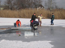 Attila előkerít egy láncfűrészt, deszkákat, és nekiáll a háromszög lék kivágásának. Röpködnek a jégdarabok, zubog a víz, ezek szerint átérte a lánc a jeget - ez sem volt biztos. A lék eltávolításhoz már többen jöttünk össze, többszöri nekifutásra végre a jégtábla kikerült a helyéről. Atti´ feldarabolta, és körberaktuk a léket egy jó nagy kör mentén, a korizók tudjanak majd róla, itt vékonyabb a jég.