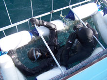 A Simon’s Town-i hadikikötő öblös sziréna-hangjára pattan ki szememből az álom. Reggel 6 óra van. Az ágyamból fekve belátni az egész False-Bay-t. A koromsötét égbolt alján alig látható, halvány ibolyaszínű csík jelzi csupán a közelgő napfelkeltét. Húsz perc múlva már a kikötői mólón húzom magam után a nyikorgó kerekű búvárboxot. Csípős a hajnal, fejem fölött hidegen sziporkázik a Dél-Keresztje. - Hi, guys! - süvölt felénk Rob harsány reggeli köszöntője. Hajónk, a Blue Pointer tatján a hajnali látóhatár bíborfényéből komoran rajzolódik ki a cápaketrec sziluettje. "Bennfentesként" egyből elfoglalom a helyem a hídon, a kormányállás mellett. A többiek a fedélzeten hallgatják Lawrence eligazítását. Felmordul a motor, a Blue Pointer méltóságteljesen fordítja az orrát a horizont aranycsíkja felé. Ahogy elhagyjuk a móló védelmét, oldalba kapjuk a görgő hullámokat. Az öböl közepén vastag, ólomszürke lepel borítja a felszínt. Néhány perc, és hajónkat elnyeli a köd. A hűvös, nyirkos levegő bekúszik széldzsekim alá. Aztán lassul a Blue Pointer futása, leáll a motor. Az orr irányában sötét sáv bontakozik ki a hajnali párából. A Seal-Island. Az enyhe fuvallat felénk hordja több tízezer fóka ugatását. A hajó kilátó fedélzetén feszülten figyeljük a tőlünk jó ötven méterre a vízből ki-ki ugró fiatal medvefókát. Hirtelen, mintegy Polaris rakéta, óriási fekete tömeg töri át a vízfelszínt. A hatalmas nagy fehér cápa megfordul a levegőben, és az összezárt állkapcsokban vergődő fókával együtt, széthulló vízpermet tölcsért vetve maga körül tűnik el a mélységben. A felkelő nap sugarai megannyi brilliánsként csillognak az aláhulló vízcseppeken. Lélegzetet sem tudtunk venni, és már minden elcsendesült. Csak az afrikai szavannák dögkeselyűihez hasonlóan a "tetthely" felett keringő sirályok rikácsolása jelzi, hogy másodpercekkel korábban itt fejeződött be egy fiatal, meggondolatlan medvefóka élete. Az idősebb, tapasztalt fókák zárt csoportban úsznak át a veszélyes "cápafolyosón", mivel az összetartó csapatot a nagy fehér nem támadja meg. (Sőt gyakran a fókacsapat intéz kollektív rohamot a csoport körül ólálkodó cápa ellen). Oh, poor seal! - sajnálkozik mellettem Monique Fallows. Már számtalanszor látta a nagy fehért zsákmányolni, de sohasem tudja szánalom nélkül nézni a póruljárt fókákat - magyarázza nekem. Időközben előbukkan a nap a parti hegyvonulat mögül, száműzve a ködöt, és gyöngyházfénnyel bevonva a tengert. A hajómotor ismét felzúg, lassú, kényelmes tempóban közelítjük a Fóka-sziget északi végét, horgonyzóhelyet keresve.Végül a szigettől 100-150 méterre kötjük ki a hajót. A szél felénk hajtja a korántsem étvágygerjesztő guanó szagot. Előkerül a csalizsák, telve véres haldarabokkal, és hangos csobbanással landol a vízbelógatott, tízkilós tonhaltörzs mellett. Jól látható a csalizsák körül az olajfolt terjedése.
