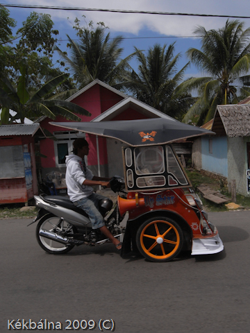Menő trimotocikliDSC_Maker DSC f 5.1 1/800 sec Hát igen, Gorontalo nagy város. Szóval itt már nem lehet tisztán a funkcióval érvényesülni, mint Marisában. Nézzük meg az aprólékosan felépített műremeket. Különösen a sofőrt hirdető hangszórók érdekesek.