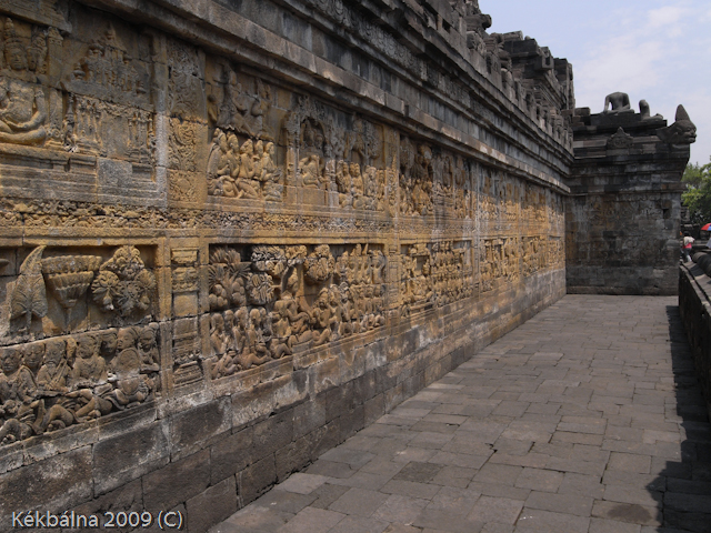 Borobudur alsóbb szintjeDSC_Maker DSC f 6 1/400 sec Ez a szintje a templomnak a fizikai létről szól, ezért aztán tele van budha jobbnál, jobb történeteivel. Volt neki egy pár. Na egy okos európai leakarta a 1920-as években fotózni ezeket a storykat. Ha már el nem tudja olvasni. De nem tudta lefotózni, mert feketék voltak a kövek. Sebaj! Fessük le, mondjuk sárgára. A fotózás után derült ki, hogy a festék nem jön le. Így maradtak a képregények sárgák. Emberünket meg Darwin díjra jelöltem volna, ha meghalt volna a festésben. Így csak hülyének tartom.