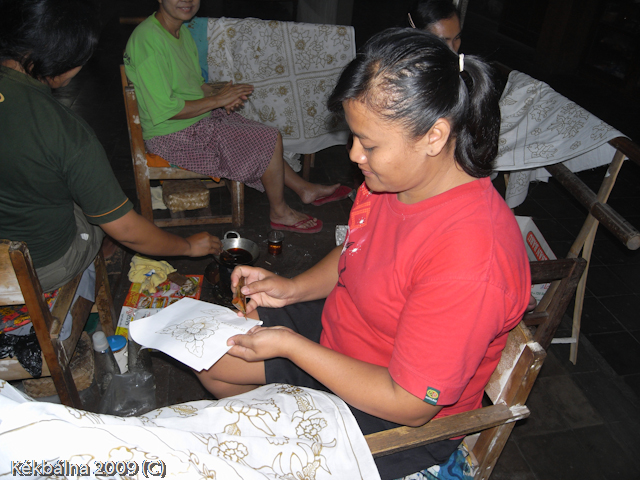 Kézi batik festésDSC_Maker DSC f 2.6 1/30 sec Junji a drága! Viaszvirágot festett nekem az írókájával. Nem irigylem. Elég gyenge megvilágítású helyen kézzel mintázzák a batikokat. Cserébe viszont a kézi batik drága.