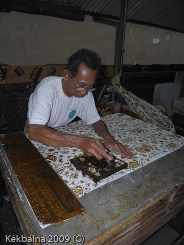 Kézi nyomásDSC_Maker DSC f 2.5 1/30 sec Na azért nem mindenki írókával viaszol. Előre készített réz mintákkal kézileg nyomják a batik mintákat. Egy réz minta egy szezonig tart. Aztán beolvasztják és újat csinálnak. Ja kérem! Ez a divat.
