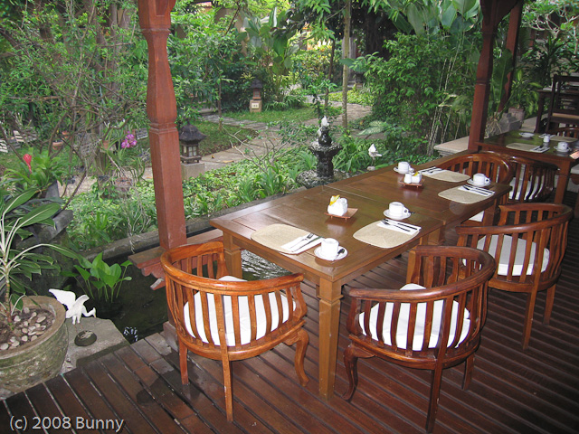 Sanur hotel étteremCanon PowerShot S70 f/2.8 1/60 sec Nem rossz így elkölteni az egyébként fincsi reggelit - csendes hátsó kert, sok víz és növényzet.
