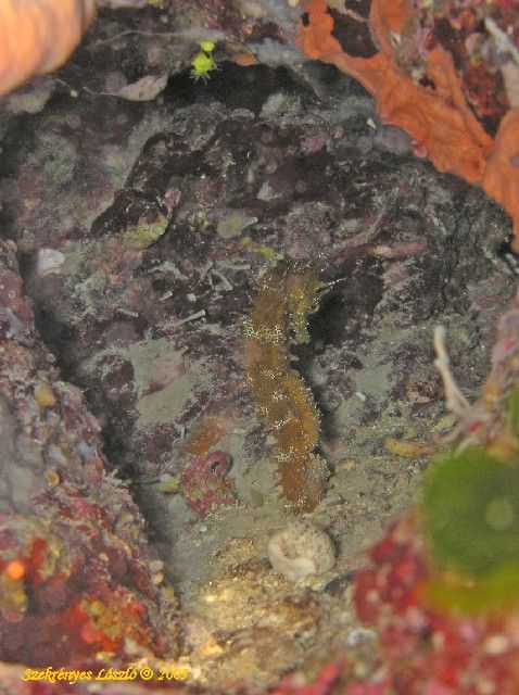 CsikóhalEgy kellemes kis merülésen egy üregbe bepillantva vettem észre ezt rejtőködő bajnokot. Kétszer is jó alaposan bevilágítottam, nem akartam hinni a szememnek. Aztán jött a feladvány. Bevilágítani egy üregbe kb 20-30 cm mélyen. Na itt kaptam el Brunot és kentem fel a falra. (Szegény bízott benne tudom mit csinálok és vagy 10 percig közelről elemezhette a zöld levelekkel benőtt falat.) Szóval Bruno tartotta a lámpát, ami irányfény volt. Egyik kezembe a vaku a másikba gép, mivel a kar ezt a beállást nem tudta.