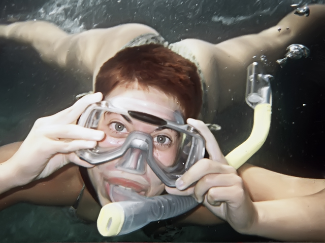 normálsága válogatja :) Nálunk egy átlagmerülés tekintélyes része úgy néz ki, hogy egymástól pár méter távolságban (persze ha a látótáv engedi a pár métert) függetlenül bogarászunk, két-három lélegzetvételenként egymásra pillantva. Ha valamelyikőnk talál valami érdekeset, odaintegeti a másikat. Ha megbeszéljük hogy egy irányban úszunk és valamelyikőnk lemarad, integetni sem kell, a másik visszafordul és odaúszik hogy megkérdezze mi a rosseb van. Így elég gyakran előfordul, hogy szemből látjuk egymást, így készült az az izé is, amit a mostani fordulóba tettem be. | ||
