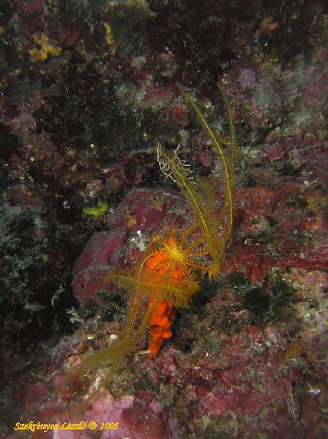 Piros tengeri liliom 2Ez a sárga színű liliom a neve szerint piros. Gondolom ezért telepedett meg ezen a piros szivacson. Vagy mert éhes volt és így több planktont tud kiszűrni?