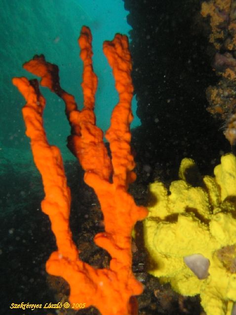 Szivacs varázsEz egy nagy próbálkozás volt több okból is. Első - használató - kevert fényes képeim egyike ez. Egy átúszható üreg elejében voltak ezek a szivacsok a háttérben a kijárat kéklik. A kép készítésében nem igazán segítettek a búvártársak akik egy jó párszor átúszták az üreget mire odaértem.