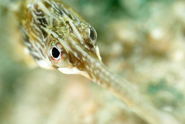 Közönséges tűhal (Syngnathus acus)Vadászat közben megfigyelni a tűhalat hatalmas élmény: szinte teljesen kicsavarja a fejét és oldalról kapja el a parányi rákocskákat, amelyekkel táplálkozik. Sokaig vár, aztán hirtelen gyorsasággal tekeri ki magát és lecsap. A kép a Pagon, a Blue Bay bázisa előtti tengerifűmezőn készült.