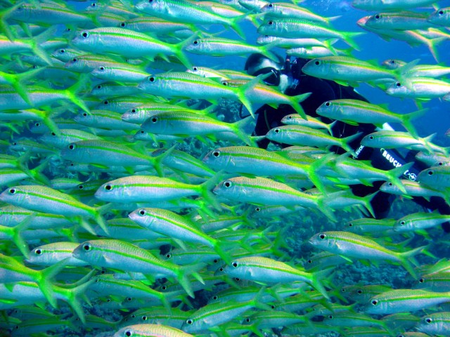 Szépek a színek, de talán jobb lett volna tágabb vágásban, ha a korallkupac látszik ívben, és úgy rajta a halak.akik kicsit most it összevissza vannak. Pedig ezeknél van egy trükk, hogy egyben legyenek (igaz, inkább videós trükk, de fotóra is jó, ha gyors a géped): mikor úszkálnak, hirtelen megrebbented őket, és akkor összebújnak, majd együtt elkezdenek előjönni. Ha azt megcsíped, klassz fotó lehet belőle. | ||
