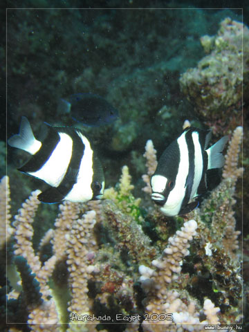 Szemtől szembeCanon PowerShot S70 f 8 1/250 sec Humbug dascyllus. Két zebrahal, egy tucat képet rálőttem ezekre az állandóan úszkáló bitangokra, mire valami használható beállásban csíptem el őket.